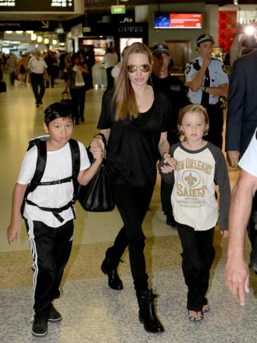 Angelina Jolie with children Pax Jolie Pitt (dark hair) and Shiloh Jolie Pitt arrive at Brisbane Domestic Airport (flight from Sydney).