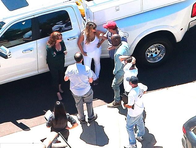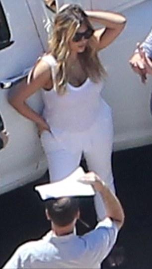 Kim, 32, looked incredible as she showed off her post-baby body in an all-white outfit of a sheer vest top and tight-fitting jeans for the trip around the property.